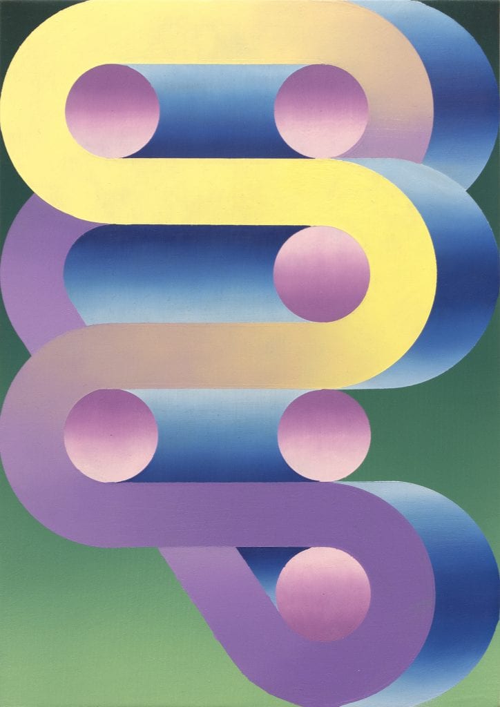 Inspired by color, Dan Perkins paints flat spaces that appear to have layers of depth. His works conjure a feeling of the sublime, intriguing the viewer while also leaving them to question what it is they are viewing. Pulling inspiration from the natural world though appearing quite digital, Perkins’ representations have paradoxical qualities that are filled with logic. Perkins is based in Brooklyn, NY.