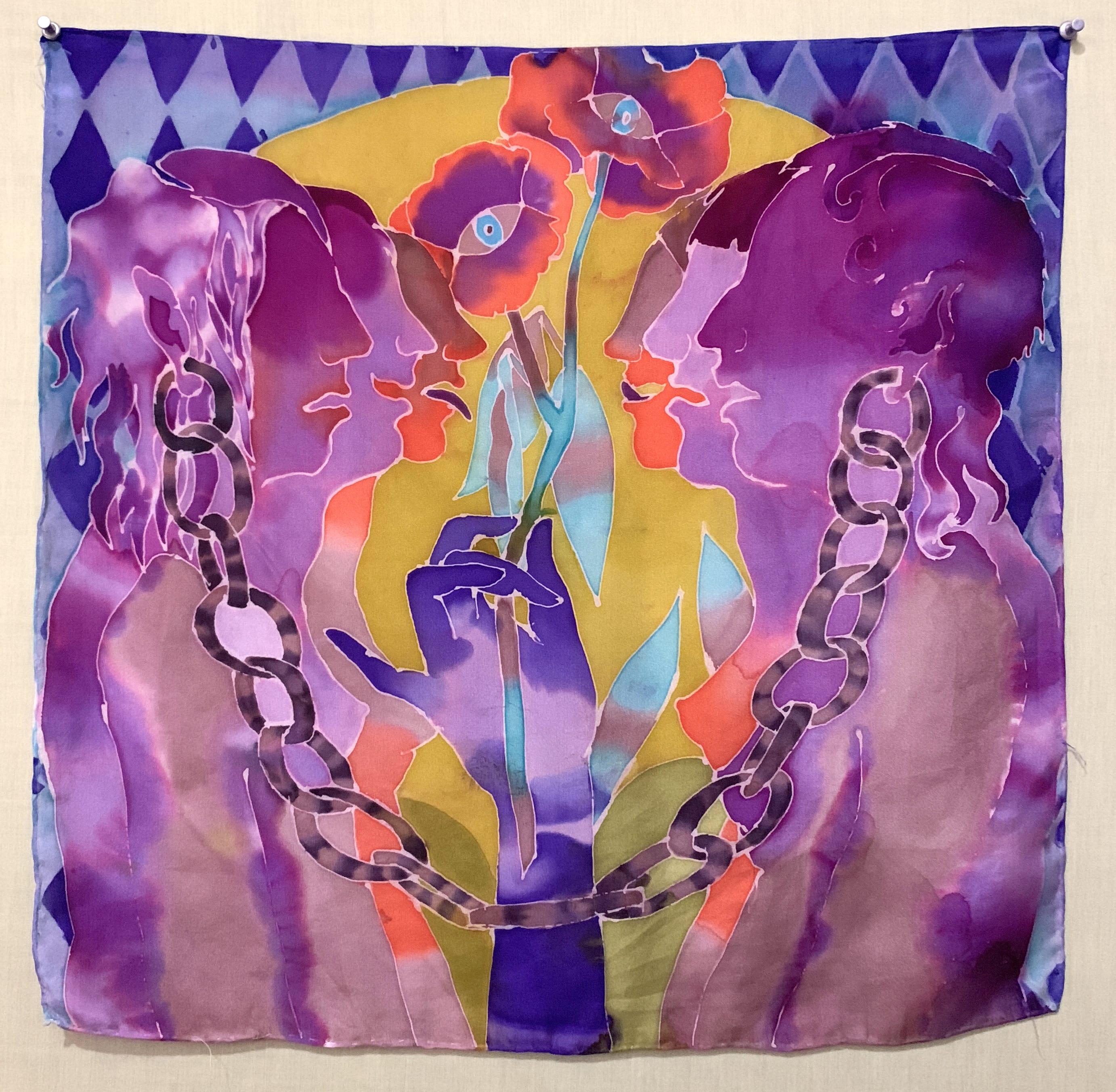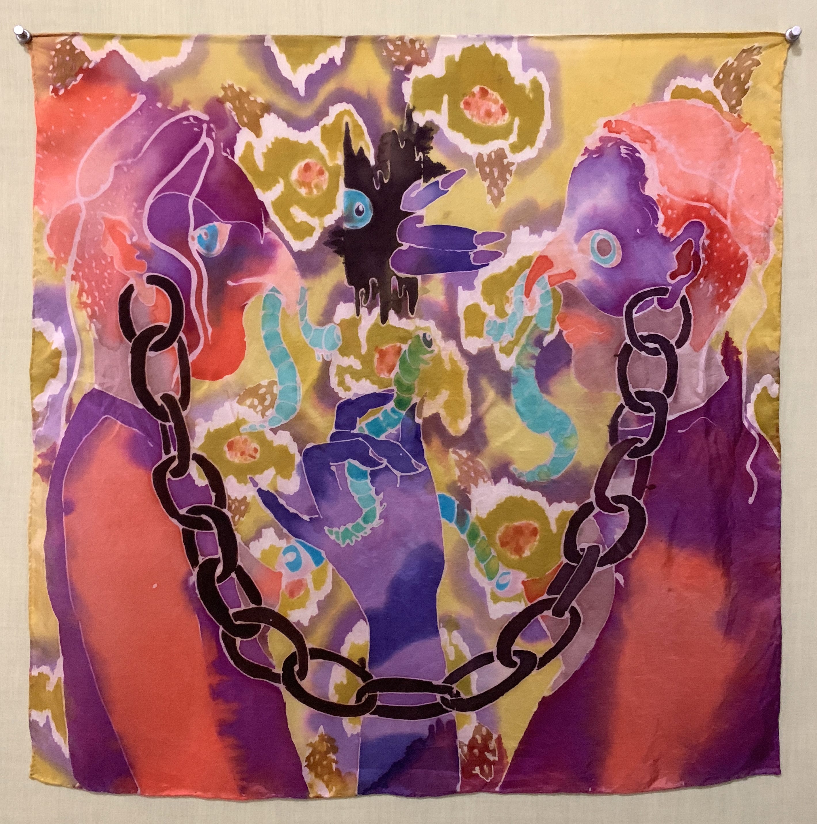 I’m all over the place in terms of inspiration, depending on what I’m making. I’m been curious about the representation of gender and sexuality throughout history so recently I’ve been looking at 17th century Japanese shunga prints and paintings, Aubrey Beardsley’s illustrations for the yellow book, ancient Mesopotamian artifacts, Egyptian vase painting, medieval folkloric prints and drawings. My silk paintings function differently. I’ve been looking at my grandmother’s twin brother’s textile designs, religious icons, stained glass windows, medieval witchcraft manuscripts. All that stuff crammed with the barrage of imagery we get slammed with every day, current events, music, fashion – it all works tangentially.