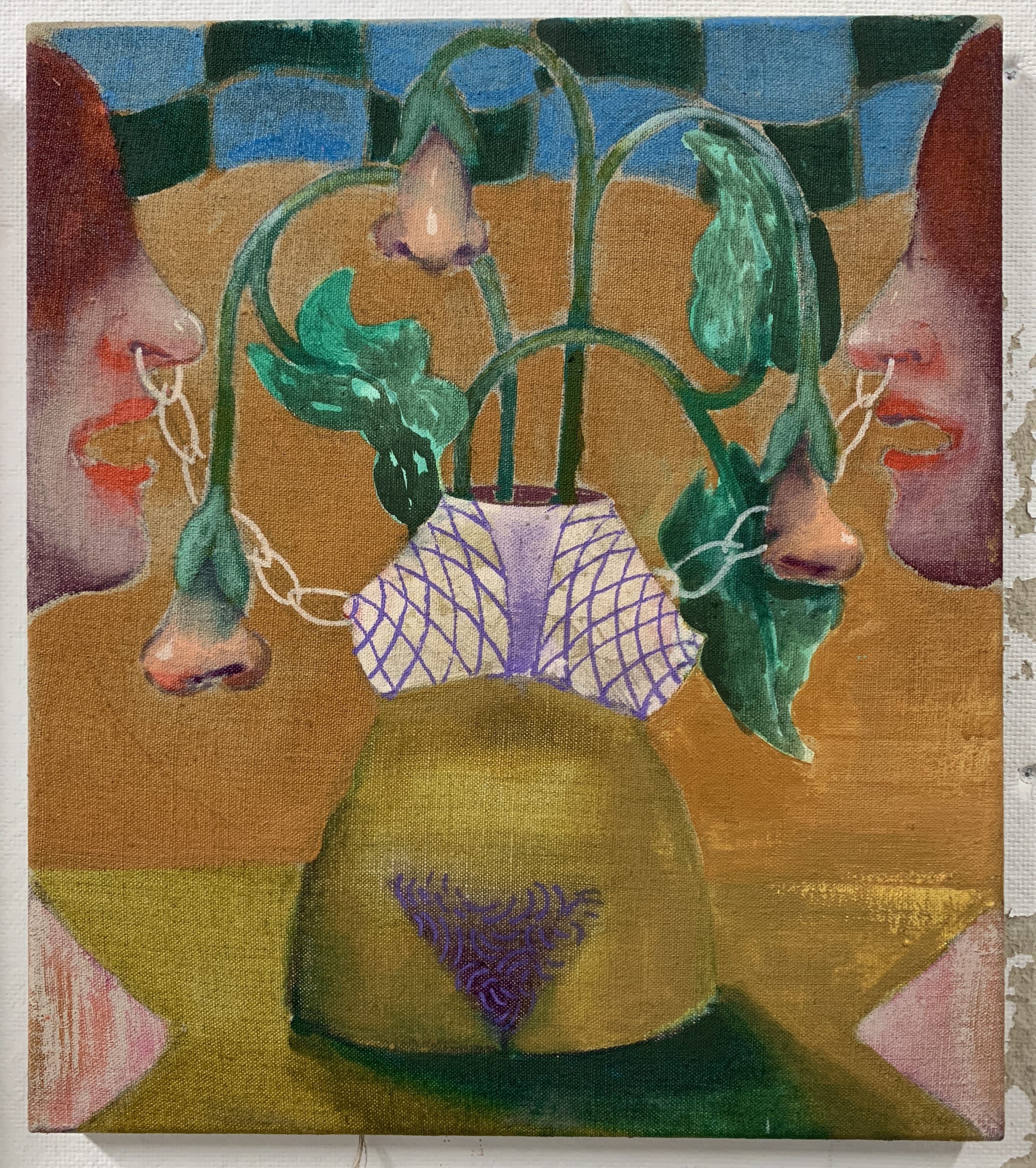 In short – I was exposed to all the sadistic tendencies of Catholicism in my upbringing so that ornate and often grotesque imagery is burned in my brain. And then my grandparents on my dad’s side are Austrian Jews who fled to South America right before the Nazis invaded Germany. I’m not interested in illustrating this history, but I do think that my experiences have sort of shaped my visual language. I make a lot of my decisions as I’m painting so I leave room for the subconscious and the absurd to help shape the narrative.