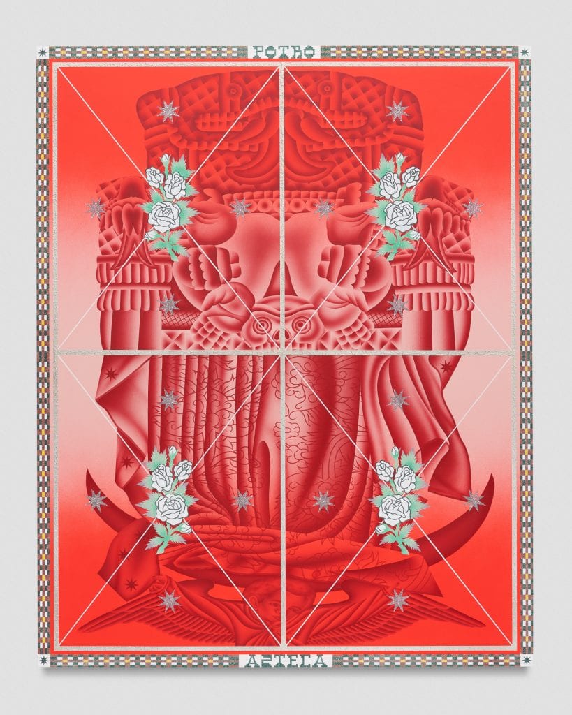 It was a huge honor to show my work alongside artists that I deeply admire. This show is a major touchpoint in my journey as a working artist and is truly reflecting to me how far I’ve come in pursuing my passion to share my work with my community. “Punch,” included two of my works, titled “Madre” and “Existence.” Madre unveils a coded visual language that deconstructs the colonialism that inherently exists within Spanish religious iconography. Within the piece “Madre,” I’m attempting to forge a reunification with a conscious blood memory that deconstructs and re-contextualizes hegemonic colonial ideas. For me, the work unveils this ancestral voice that is constantly being challenged and repressed by the institution, our colonial history, and the ways that we are conditioned to relate to our environment and each other. When I made this work, it pushed me to recognize the importance of sacred iconography and ceremony, and it made me reflect on the continuation in my natural instinct to worship Coatlicue, Mexica earth goddess.