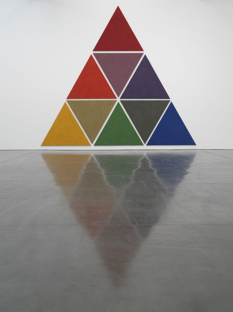 Upon closer inspection, the monumental works above convey a minimalistic subtlety based on color and shape. Along the edges of each work is a clear layer of bright pigment underneath the riddled, black sand surface. That specific color is then matched by single dots painted at each crest of the divots. Molded out of a mixture of sand, oil and pigment, she creates these “radiating indentations” giving way to grand, repetitive paintings. There is something soothing in those tedious strokes and the way in which each one coaxes a cohesive shape out of an otherwise monochromatic canvas.