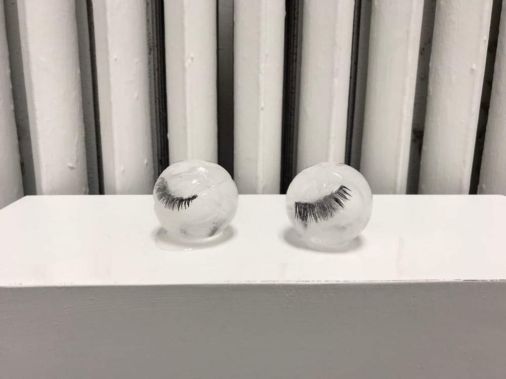 The sculptures vary in size and material – A pairs of dirty socks, a T-shirt, old studio rags, a pile of assorted clothes, etc. When the adhesive cures, they have a heavy and wet look to them. Sometimes the clothing takes on a more cartoonish quality similar to Pepe’s floating clothes, or simply look like laundry scattered around the floor. In some cases, I don’t use clothing at all. Dog leashes, frozen false eyelash, kitchen knives, blue painters tape – anything is fair game.